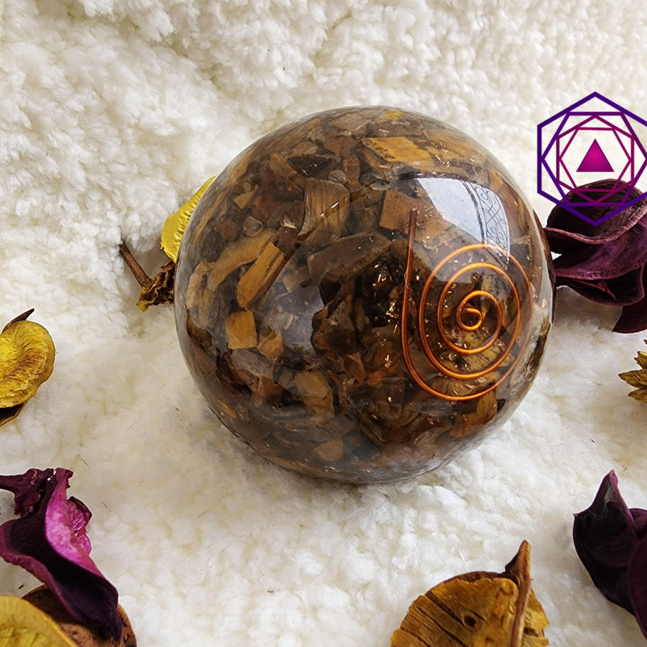 Formation: Tiger Eye is a type of quartz that forms when crocidolite fibers are replaced with silica. The crystal chips are carefully selected and embedded in the resin to create the orgone sphere.